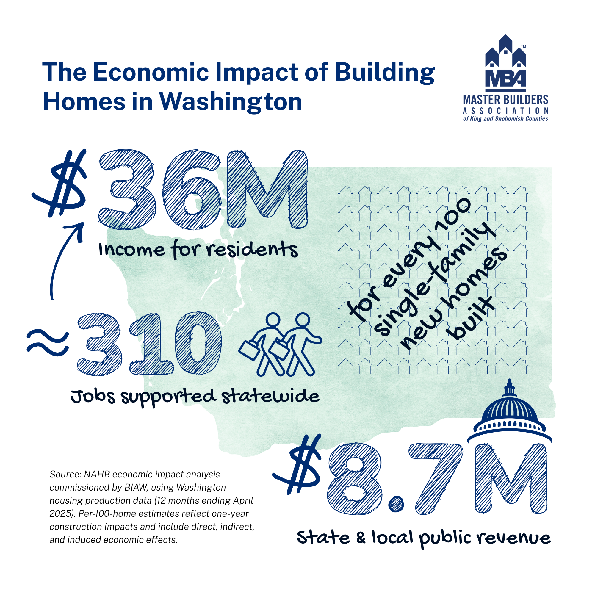 At a more practical level, NAHB’s findings show that every 100 homes built in Washington generate approximately $34 million in income, $7 million in public revenue, and support nearly 300 jobs—illustrating why residential development produces significant returns for both local economies and public budgets.